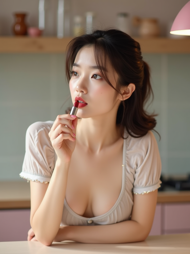 model holding a lipstick, applying it slowly , in a pastel kitchen while leaning over the counter with visible cleavage or chest