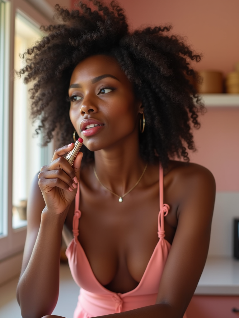 model holding a lipstick, applying it slowly , in a pastel kitchen while leaning over the counter with visible cleavage or chest