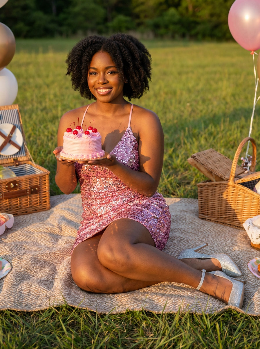 model holding a slice of pink cake with cherries, smiling at the camera, wearing a sparkly pink party dress and glitter heels , golden hour lighting, birthday picnic mood