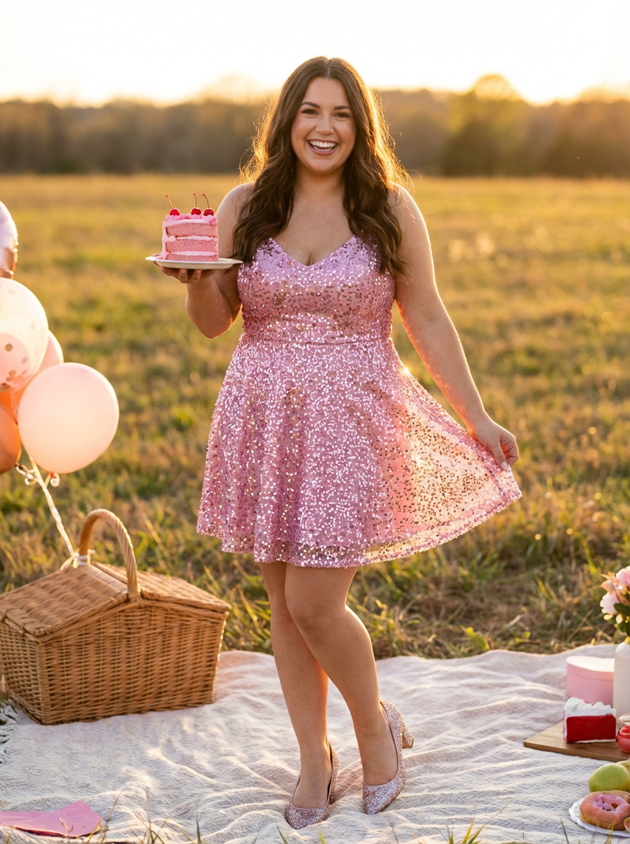model holding a slice of pink cake with cherries, smiling at the camera, wearing a sparkly pink party dress and glitter heels , golden hour lighting, birthday picnic mood