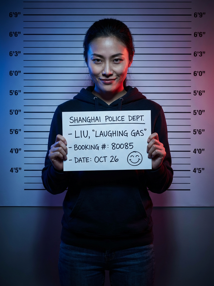model holding funny custom booking sign, smirking expression, dramatic police lighting, mugshot composition