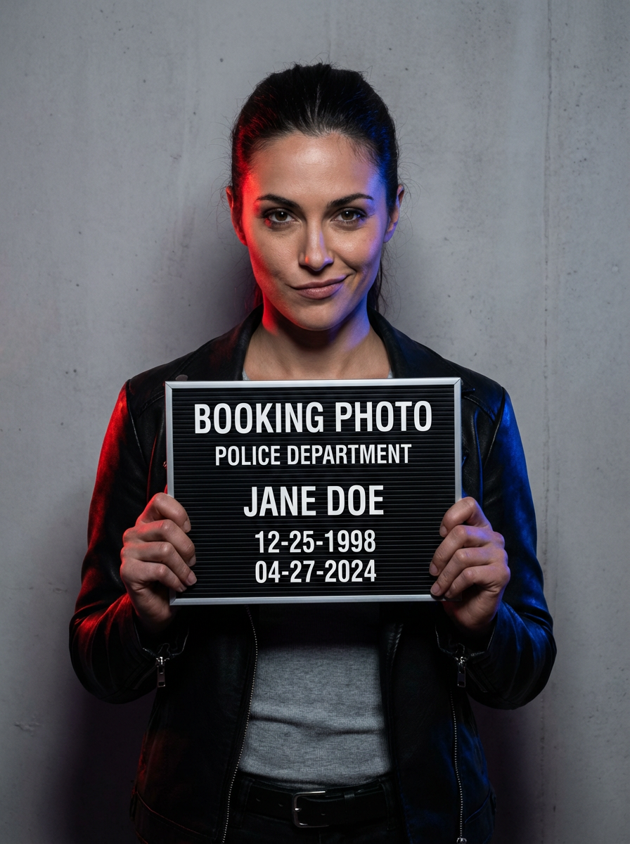 model holding funny custom booking sign, smirking expression, dramatic police lighting, mugshot composition