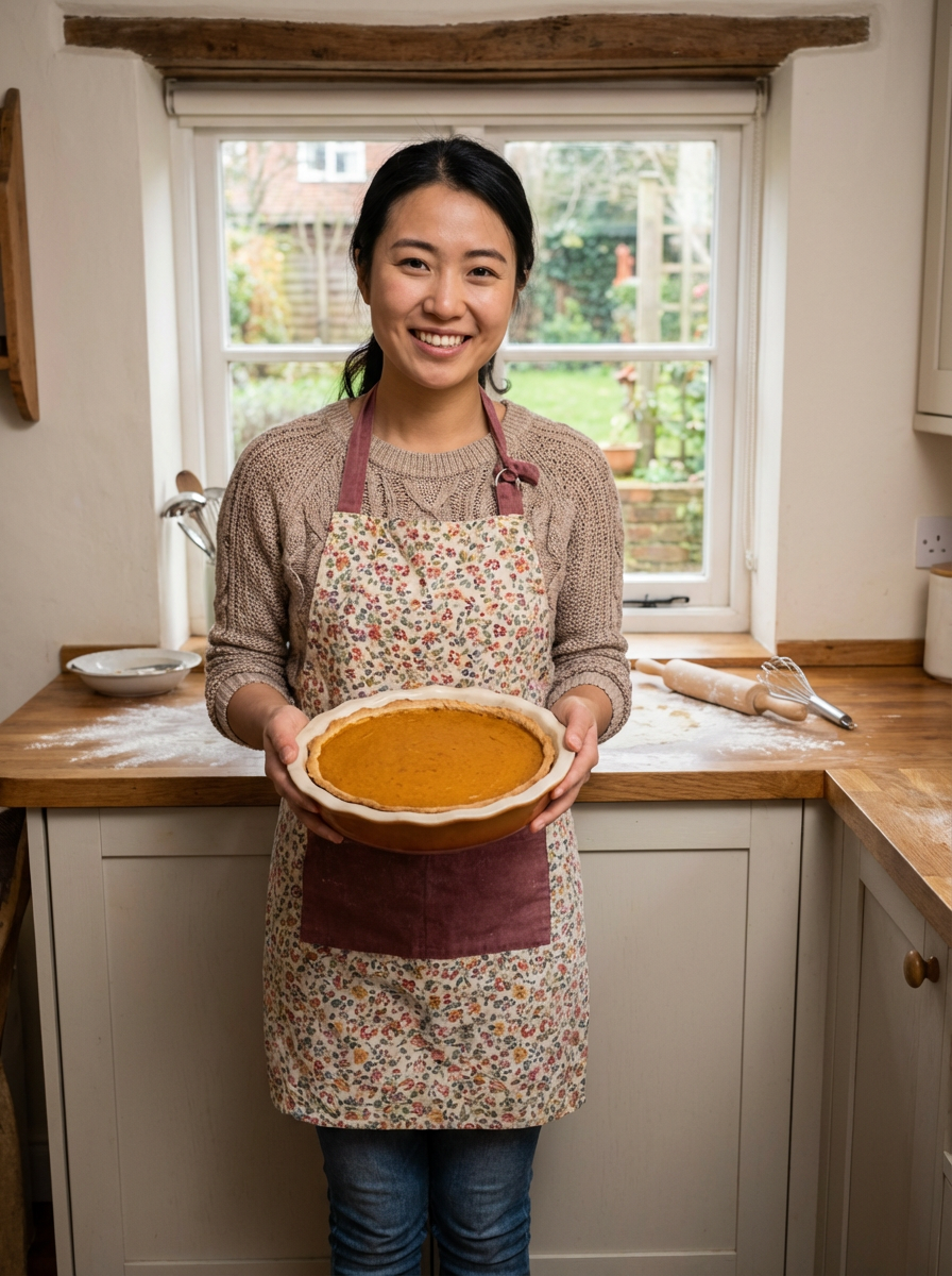 model holding pumpkin pie, kitchen setting, cute apron , baking scene