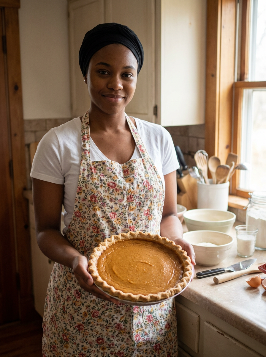 model holding pumpkin pie, kitchen setting, cute apron , baking scene