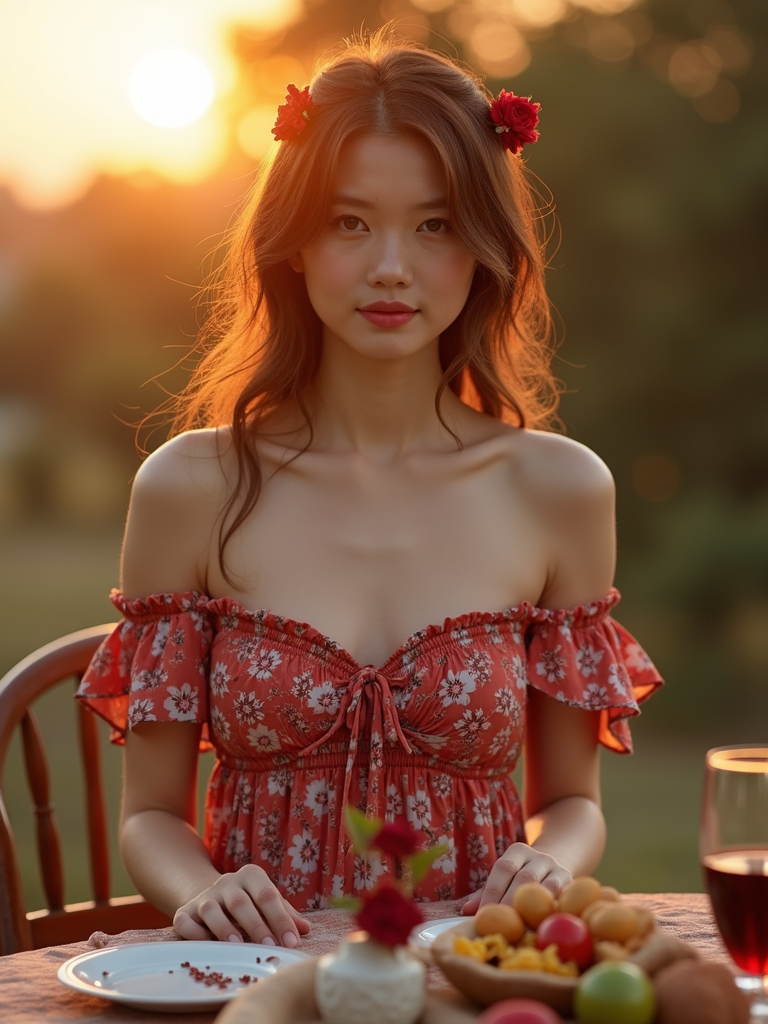 model hosting a traditional family dinner outside at sunset, wearing a floral off-the-shoulder smocked dress with a sweetheart neckline and a thigh-high slit