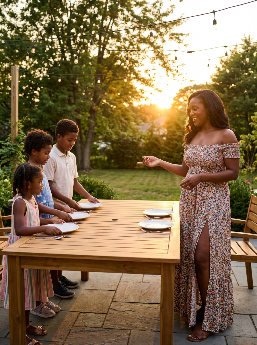model hosting a traditional family dinner outside at sunset with her four children setting the table, wearing a floral off-the-shoulder smocked dress with a sweetheart neckline and a thigh-high slit