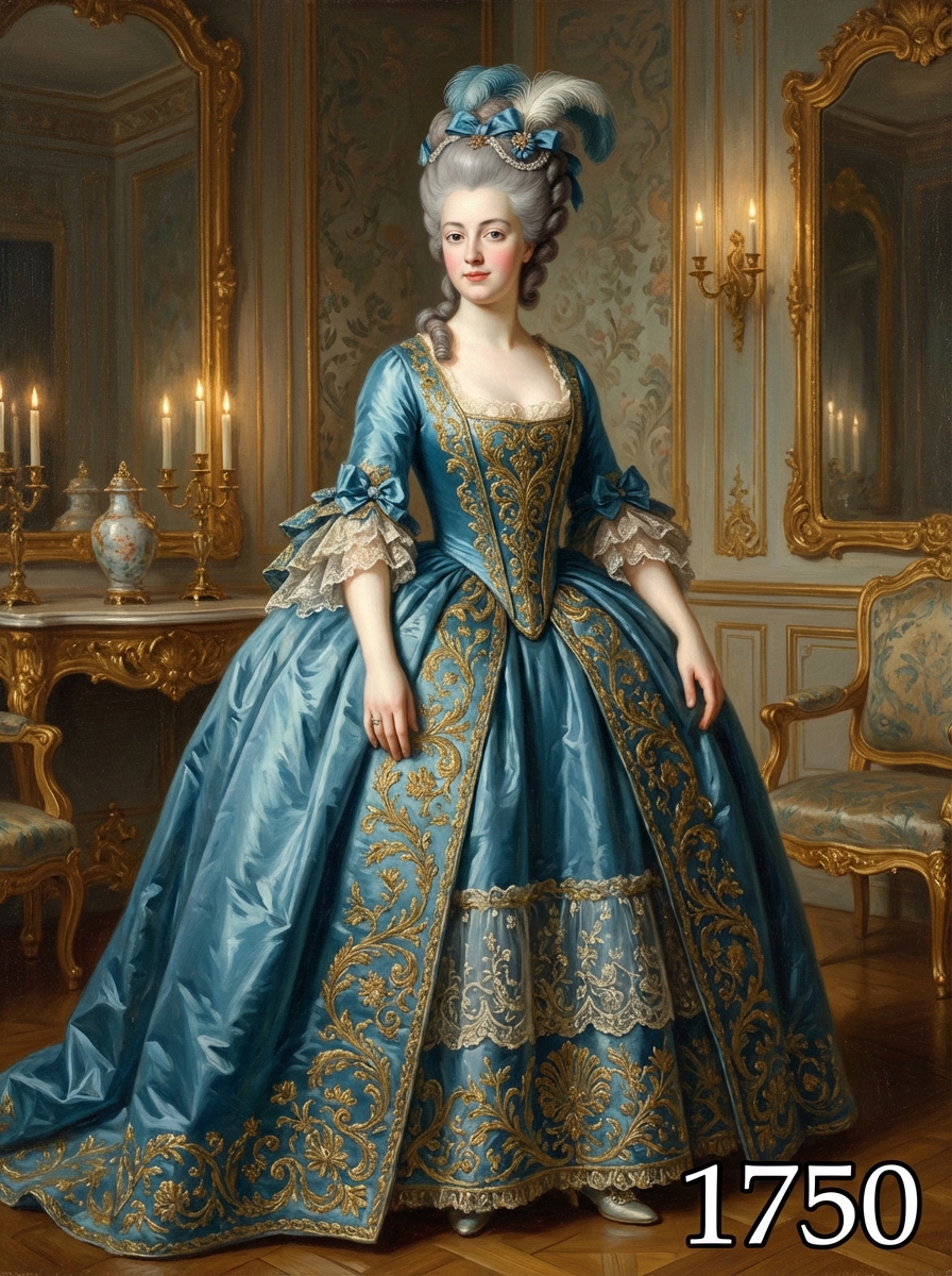 model in 1750s Georgian era portrait, wearing an opulent rococo gown with wide panniers, elaborate embroidery, and powdered wig adorned with ribbons and feathers , standing in an elegant 18th century salon with gilded mirrors and baroque furniture, painted in the style of classical portraiture with soft candlelight, text overlay in bottom corner reading "1750" in white sans serif font with black outline