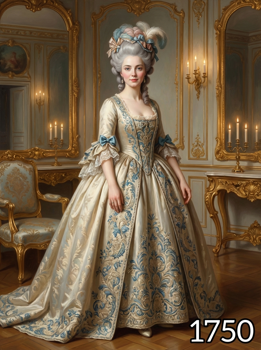 model in 1750s Georgian era portrait, wearing an opulent rococo gown with wide panniers, elaborate embroidery, and powdered wig adorned with ribbons and feathers , standing in an elegant 18th century salon with gilded mirrors and baroque furniture, painted in the style of classical portraiture with soft candlelight, text overlay in bottom corner reading "1750" in white sans serif font with black outline