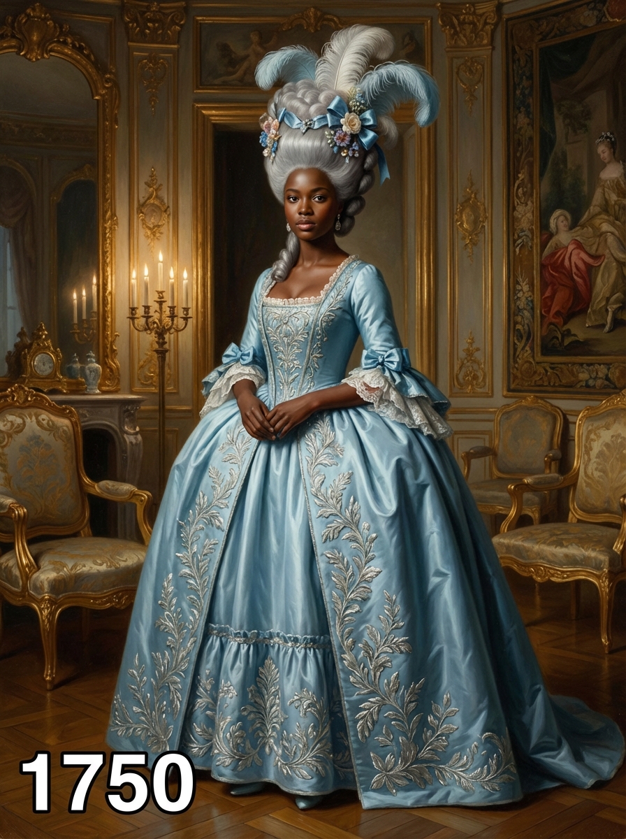 model in 1750s Georgian era portrait, wearing an opulent rococo gown with wide panniers, elaborate embroidery, and powdered wig adorned with ribbons and feathers , standing in an elegant 18th century salon with gilded mirrors and baroque furniture, painted in the style of classical portraiture with soft candlelight, text overlay in bottom corner reading "1750" in white sans serif font with black outline