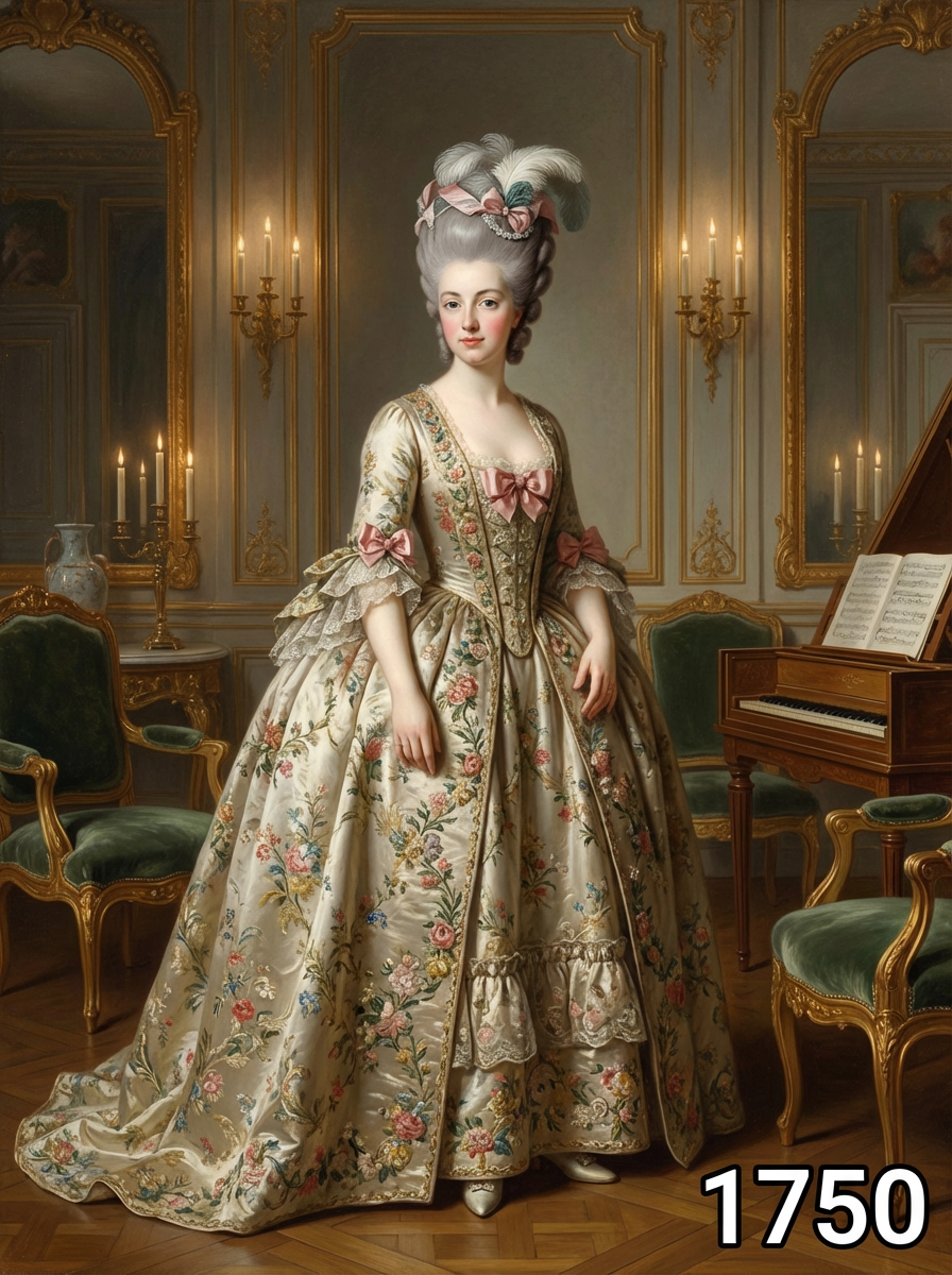 model in 1750s Georgian era portrait, wearing an opulent rococo gown with wide panniers, elaborate embroidery, and powdered wig adorned with ribbons and feathers , standing in an elegant 18th century salon with gilded mirrors and baroque furniture, painted in the style of classical portraiture with soft candlelight, text overlay in bottom corner reading "1750" in white sans serif font with black outline