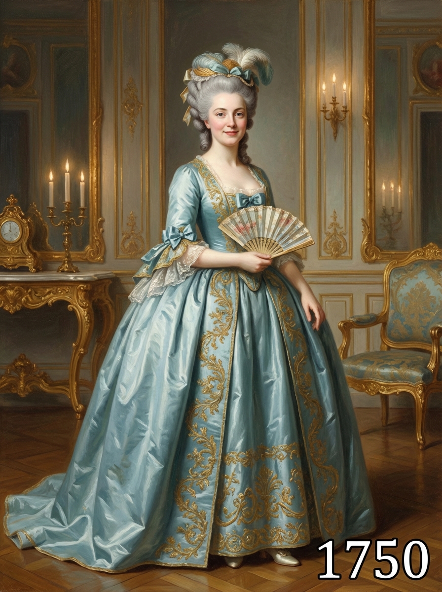 model in 1750s Georgian era portrait, wearing an opulent rococo gown with wide panniers, elaborate embroidery, and powdered wig adorned with ribbons and feathers , standing in an elegant 18th century salon with gilded mirrors and baroque furniture, painted in the style of classical portraiture with soft candlelight, text overlay in bottom corner reading "1750" in white sans serif font with black outline