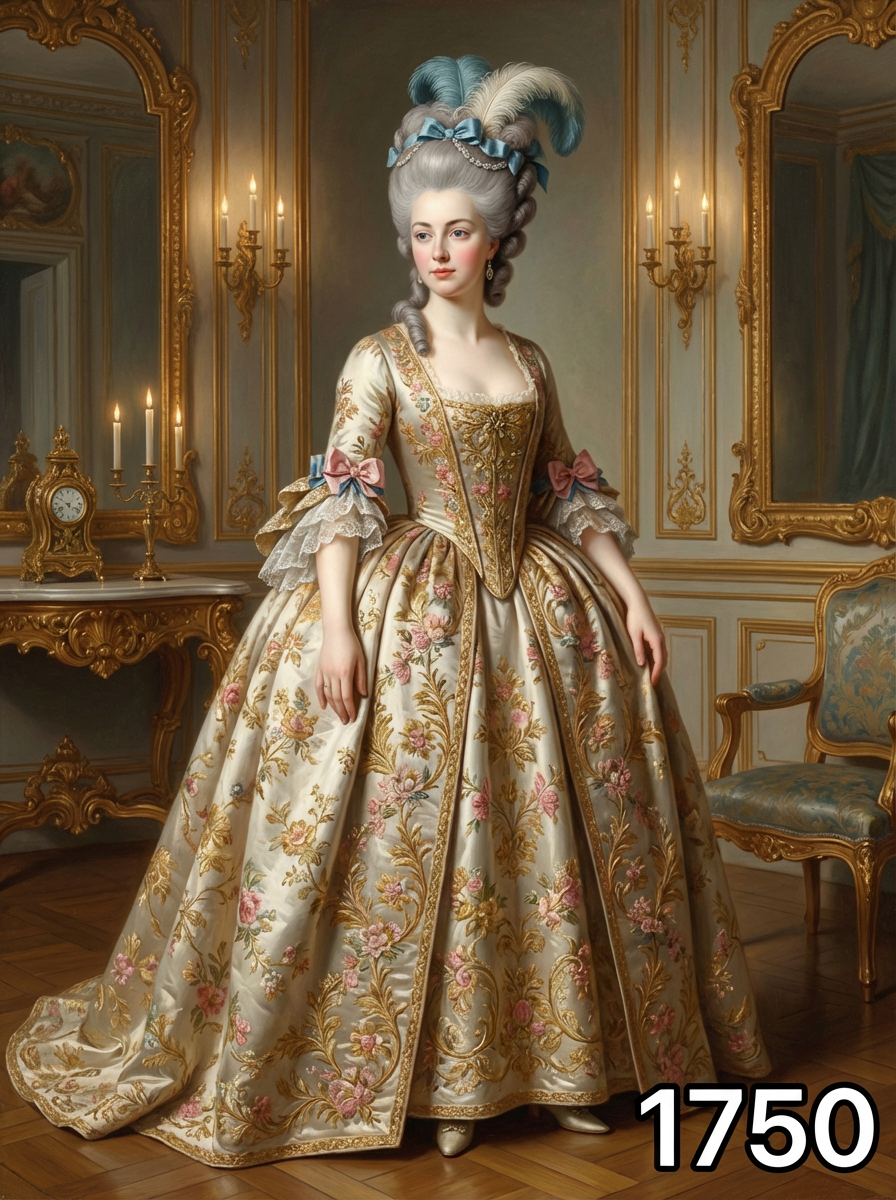 model in 1750s Georgian era portrait, wearing an opulent rococo gown with wide panniers, elaborate embroidery, and powdered wig adorned with ribbons and feathers , standing in an elegant 18th century salon with gilded mirrors and baroque furniture, painted in the style of classical portraiture with soft candlelight, text overlay in bottom corner reading "1750" in white sans serif font with black outline
