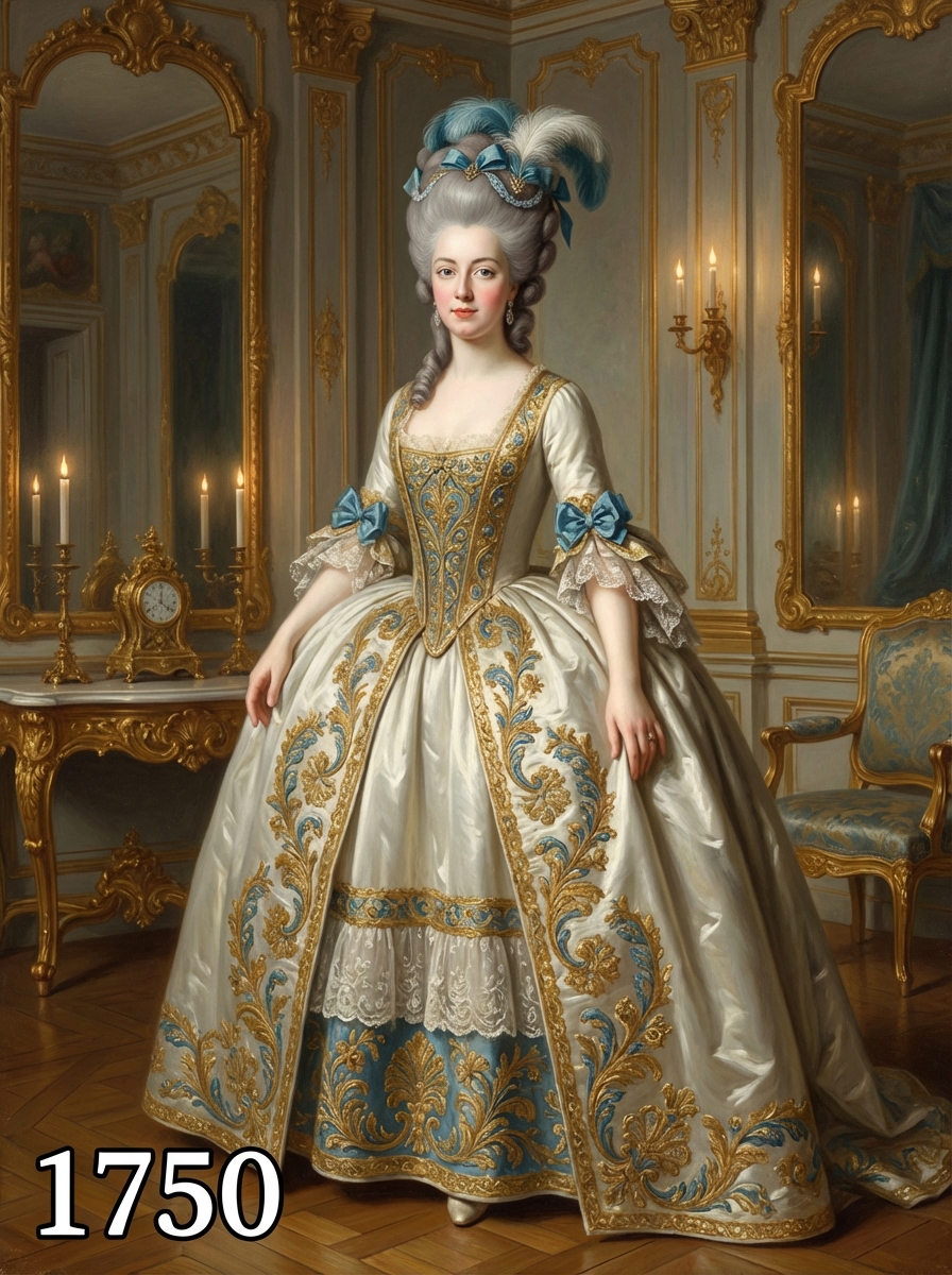 model in 1750s Georgian era portrait, wearing an opulent rococo gown with wide panniers, elaborate embroidery, and powdered wig adorned with ribbons and feathers , standing in an elegant 18th century salon with gilded mirrors and baroque furniture, painted in the style of classical portraiture with soft candlelight, text overlay in bottom corner reading "1750" in white sans serif font with black outline