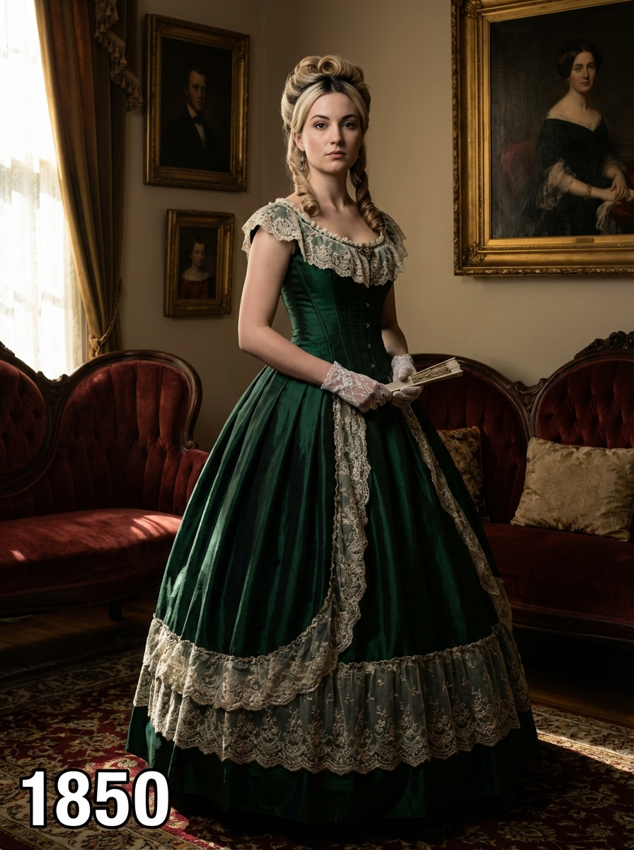 model in 1850s Victorian portrait, wearing an elaborate ball gown with corseted bodice, full skirt with layers of petticoats, and intricate lace details, hair in an elegant updo with ringlets , posed in an ornate Victorian parlor with rich velvet furniture and oil paintings, dramatic chiaroscuro lighting, text overlay in bottom corner reading "1850" in white sans serif font with black outline