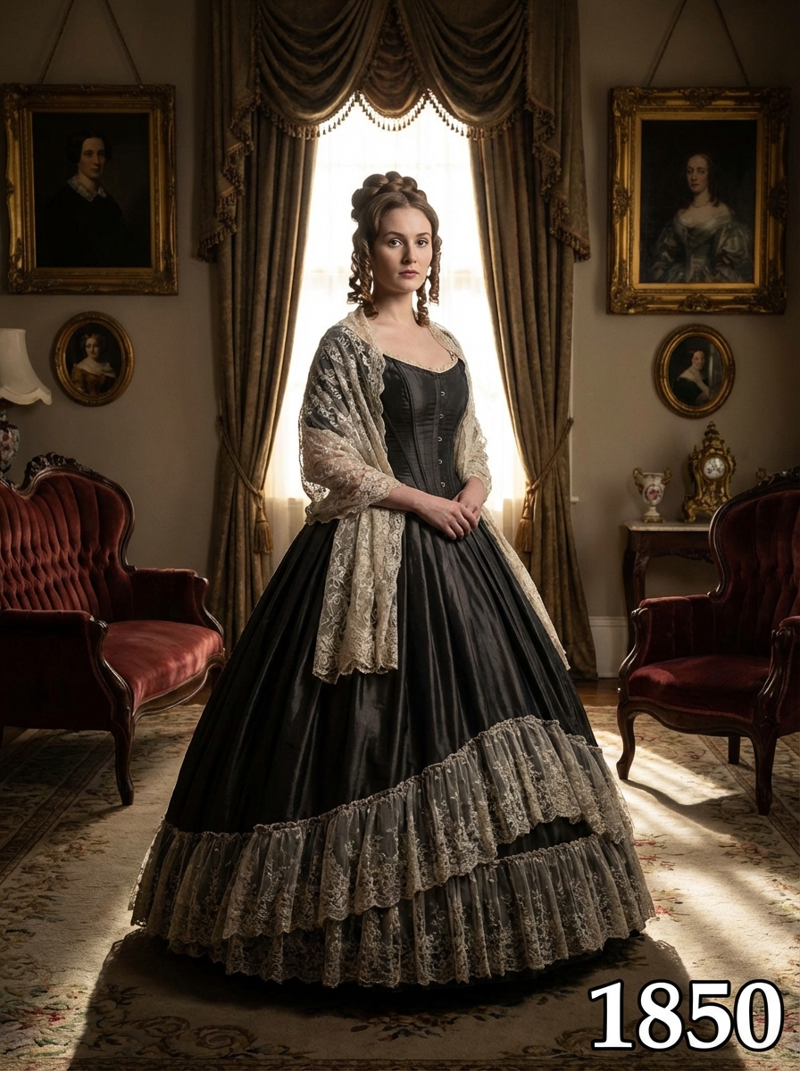 model in 1850s Victorian portrait, wearing an elaborate ball gown with corseted bodice, full skirt with layers of petticoats, and intricate lace details, hair in an elegant updo with ringlets , posed in an ornate Victorian parlor with rich velvet furniture and oil paintings, dramatic chiaroscuro lighting, text overlay in bottom corner reading "1850" in white sans serif font with black outline