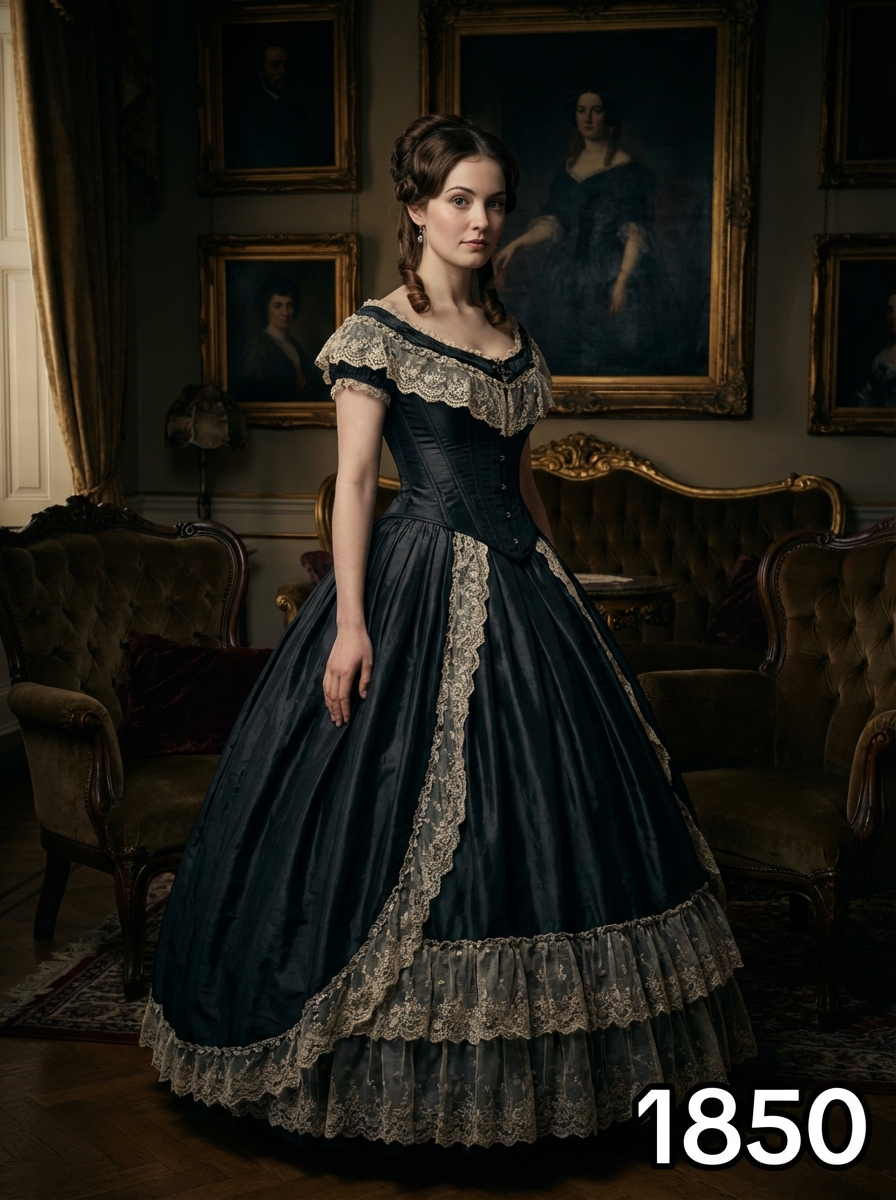 model in 1850s Victorian portrait, wearing an elaborate ball gown with corseted bodice, full skirt with layers of petticoats, and intricate lace details, hair in an elegant updo with ringlets , posed in an ornate Victorian parlor with rich velvet furniture and oil paintings, dramatic chiaroscuro lighting, text overlay in bottom corner reading "1850" in white sans serif font with black outline