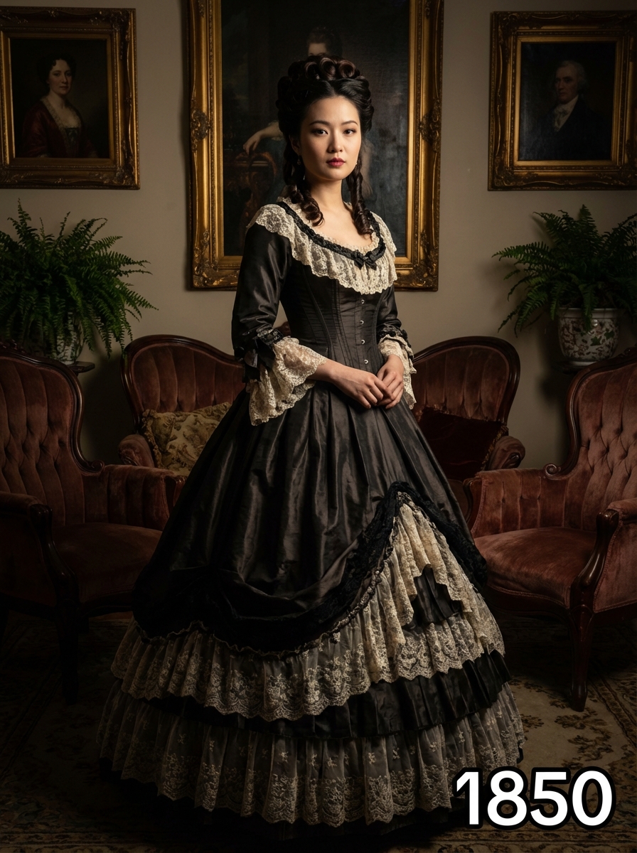model in 1850s Victorian portrait, wearing an elaborate ball gown with corseted bodice, full skirt with layers of petticoats, and intricate lace details, hair in an elegant updo with ringlets , posed in an ornate Victorian parlor with rich velvet furniture and oil paintings, dramatic chiaroscuro lighting, text overlay in bottom corner reading "1850" in white sans serif font with black outline
