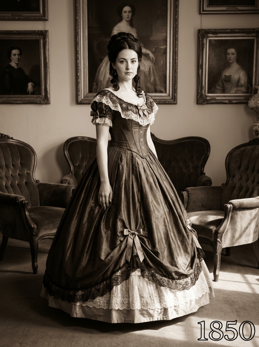 model in 1850s Victorian portrait, wearing an elaborate ball gown with corseted bodice, full skirt with layers of petticoats, and intricate lace details, hair in an elegant updo with ringlets , posed in an ornate Victorian parlor with rich velvet furniture and oil paintings, dramatic chiaroscuro lighting, text overlay in bottom corner reading "1850" in white sans serif font with black outline