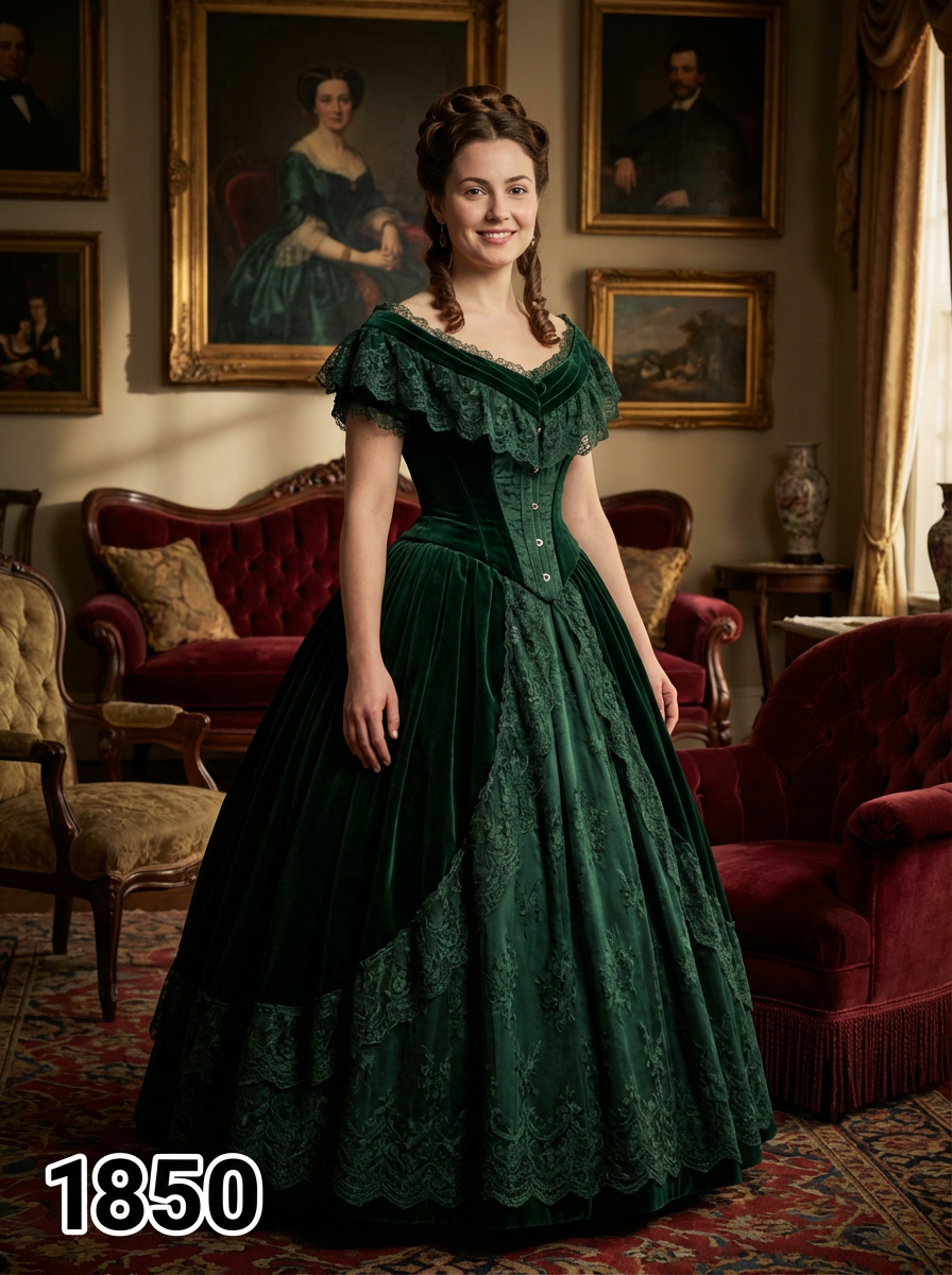 model in 1850s Victorian portrait, wearing an elaborate ball gown with corseted bodice, full skirt with layers of petticoats, and intricate lace details, hair in an elegant updo with ringlets , posed in an ornate Victorian parlor with rich velvet furniture and oil paintings, dramatic chiaroscuro lighting, text overlay in bottom corner reading "1850" in white sans serif font with black outline