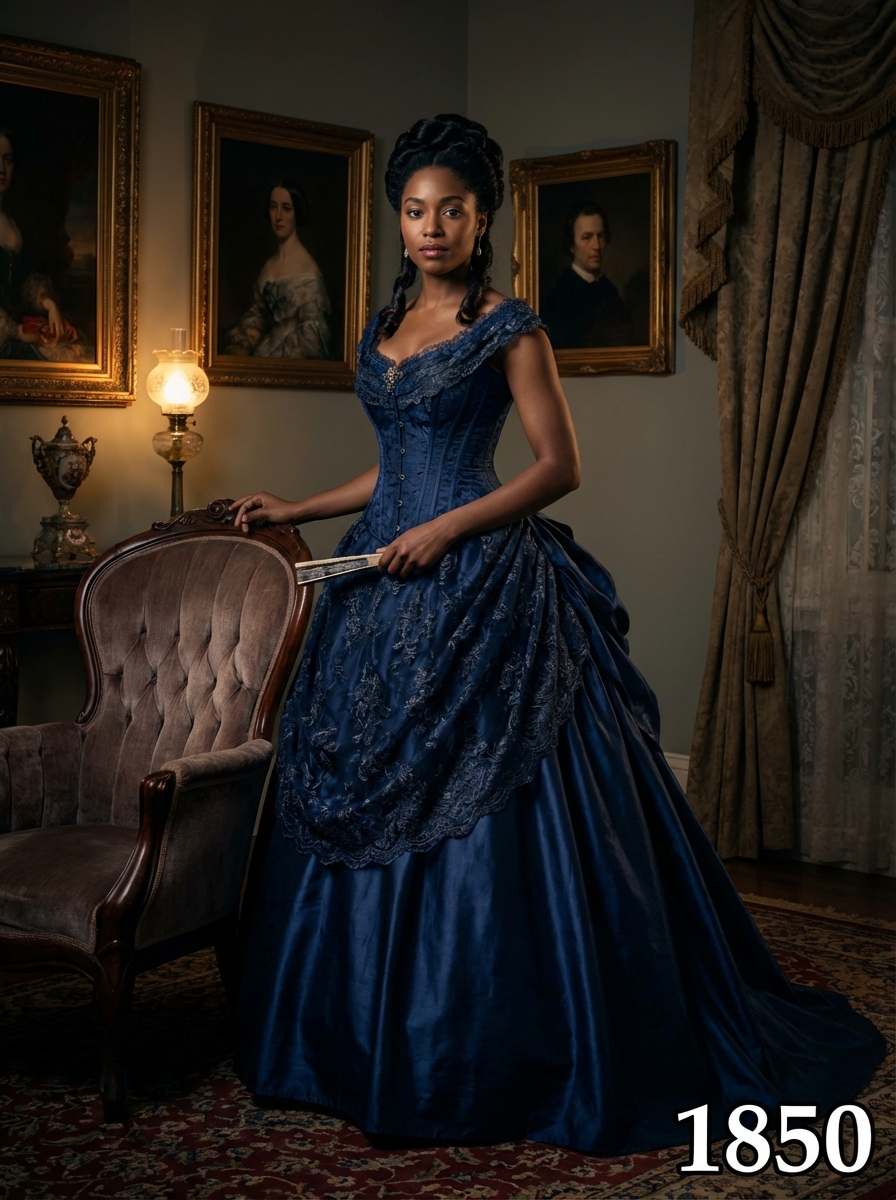 model in 1850s Victorian portrait, wearing an elaborate ball gown with corseted bodice, full skirt with layers of petticoats, and intricate lace details, hair in an elegant updo with ringlets , posed in an ornate Victorian parlor with rich velvet furniture and oil paintings, dramatic chiaroscuro lighting, text overlay in bottom corner reading "1850" in white sans serif font with black outline