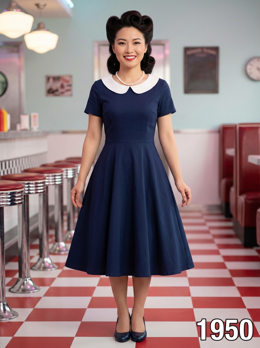 model in 1950s style portrait, wearing a classic A-line dress with peter pan collar and pearl necklace, victory rolls hairstyle , standing in a vintage diner with checkered floors and chrome details, soft studio lighting reminiscent of golden age Hollywood glamour photography, text overlay in bottom corner reading "1950" in white sans serif font with black outline