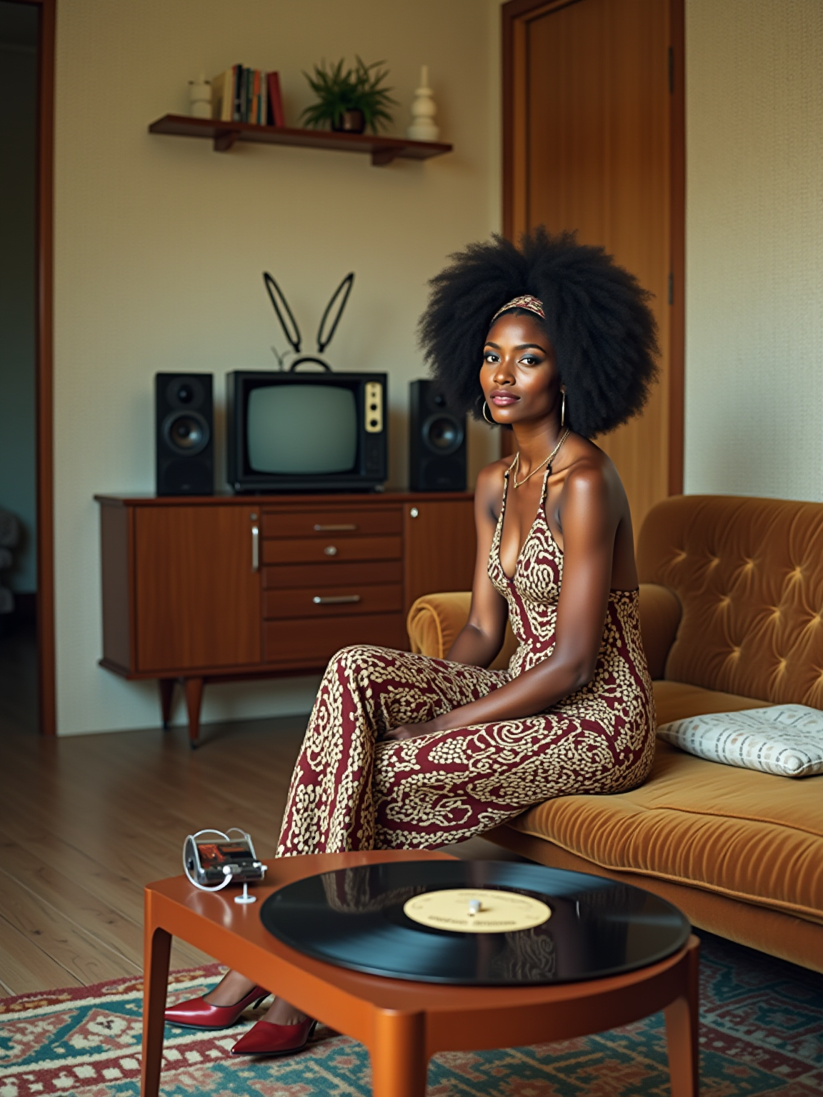 model in a 60s living room with sunken conversation pit, wearing a psychedelic print caftan with headband , sitting next to a hi-fi stereo console, collection of vinyl LPs spread on a kidney-shaped coffee table, black and white TV with rabbit ears antenna