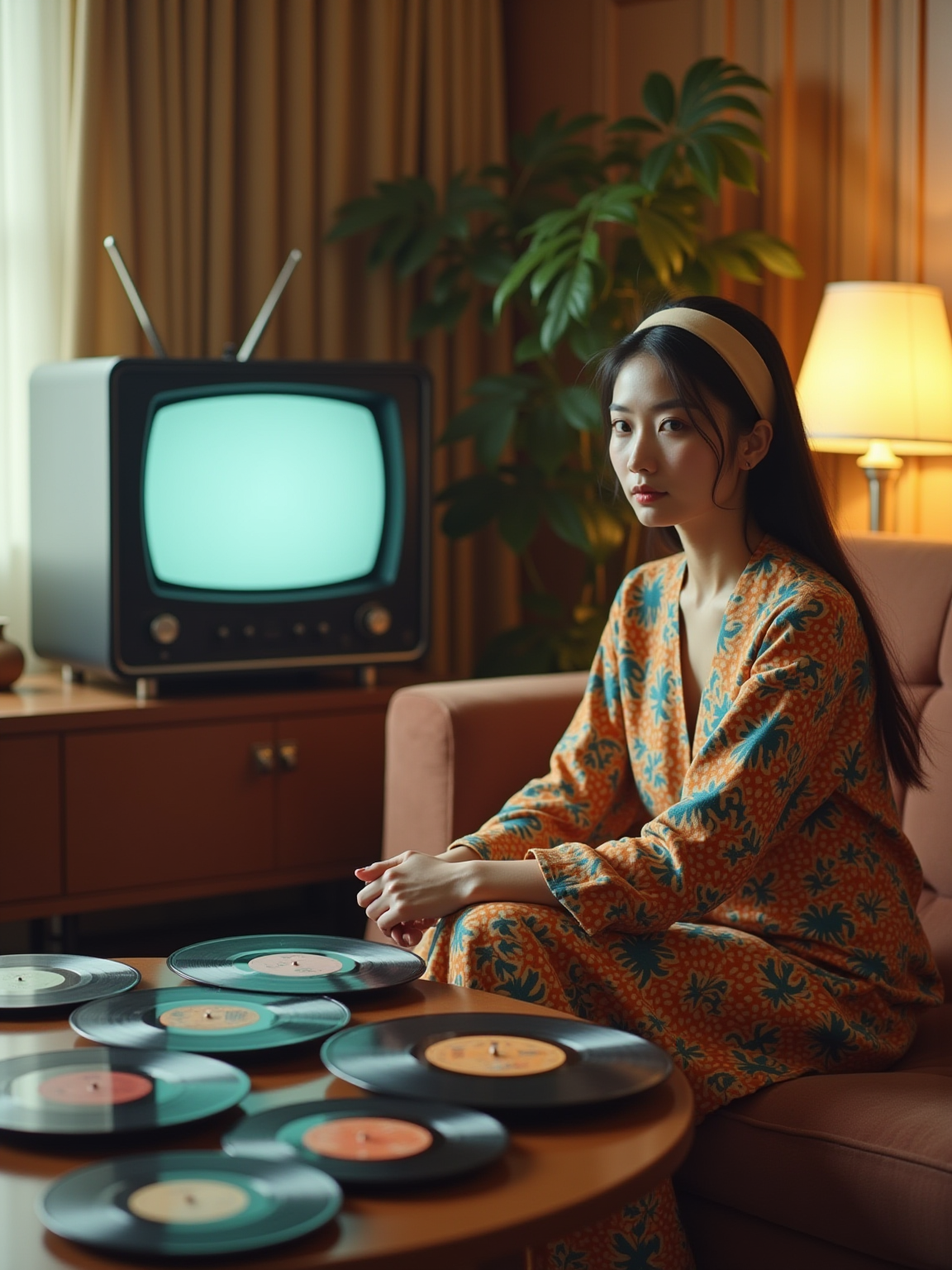 model in a 60s living room with sunken conversation pit, wearing a psychedelic print caftan with headband , sitting next to a hi-fi stereo console, collection of vinyl LPs spread on a kidney-shaped coffee table, black and white TV with rabbit ears antenna