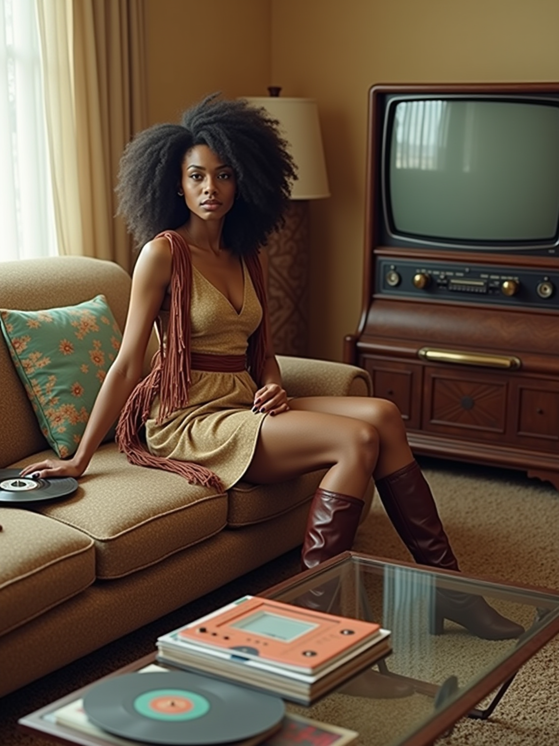 model in a 70s living room with shag carpet, wearing a wrap dress with knee-high boots and fringe vest , sitting next to a console stereo with built-in turntable, collection of vinyl records spread on a glass coffee table with geometric base, wood-paneled TV with dial tuner