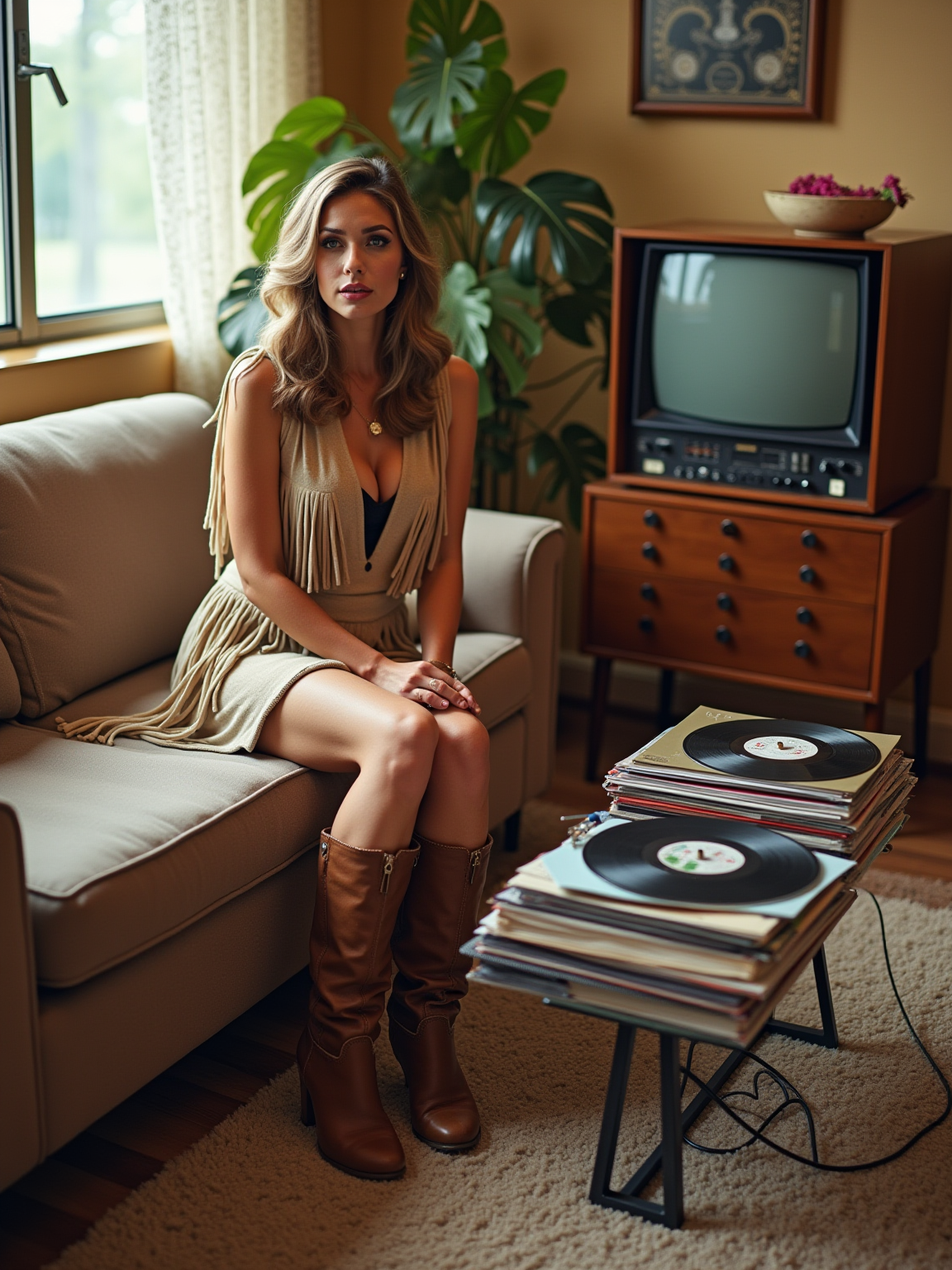 model in a 70s living room with shag carpet, wearing a wrap dress with knee-high boots and fringe vest , sitting next to a console stereo with built-in turntable, collection of vinyl records spread on a glass coffee table with geometric base, wood-paneled TV with dial tuner