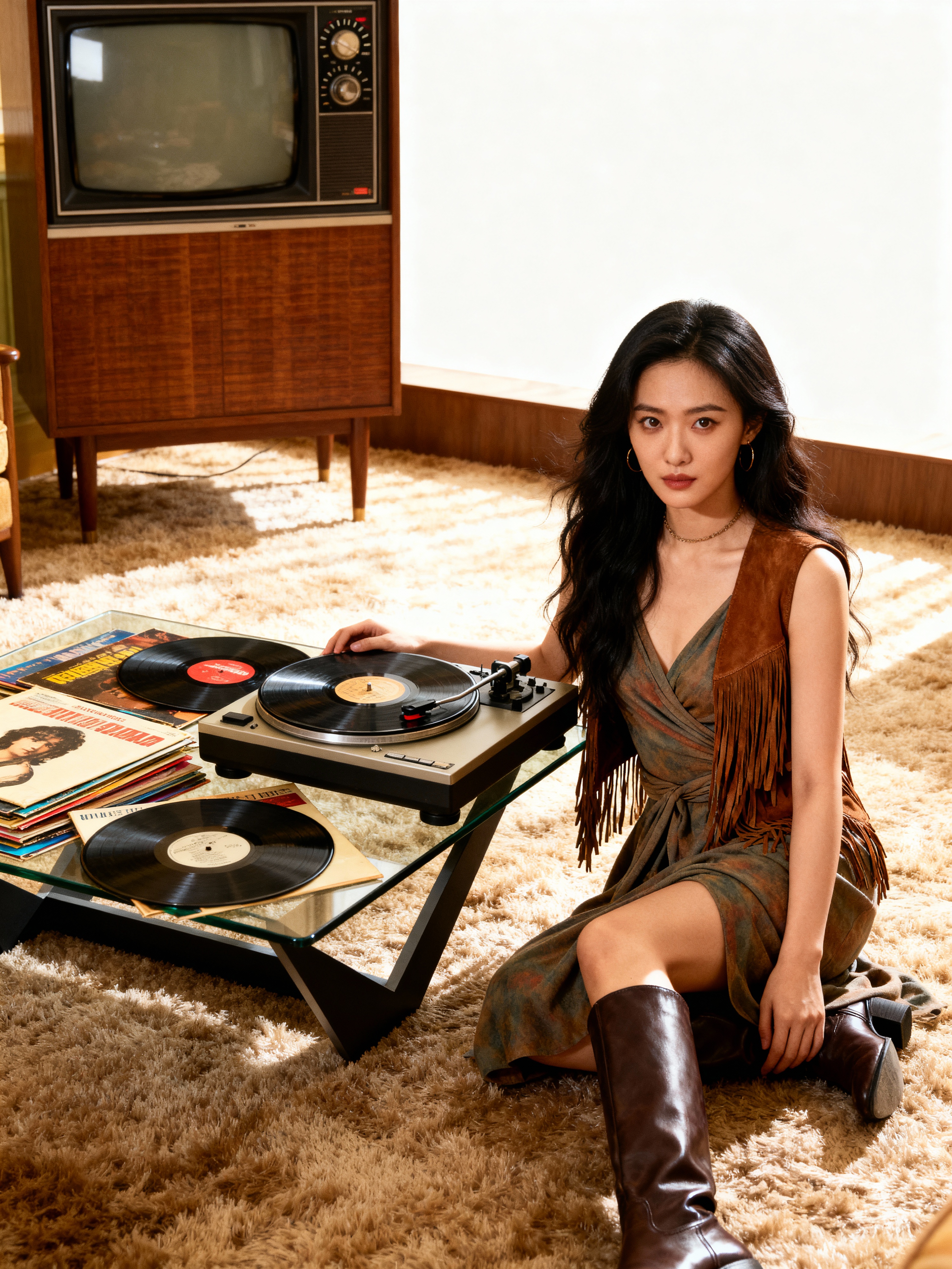 model in a 70s living room with shag carpet, wearing a wrap dress with knee-high boots and fringe vest , sitting next to a console stereo with built-in turntable, collection of vinyl records spread on a glass coffee table with geometric base, wood-paneled TV with dial tuner