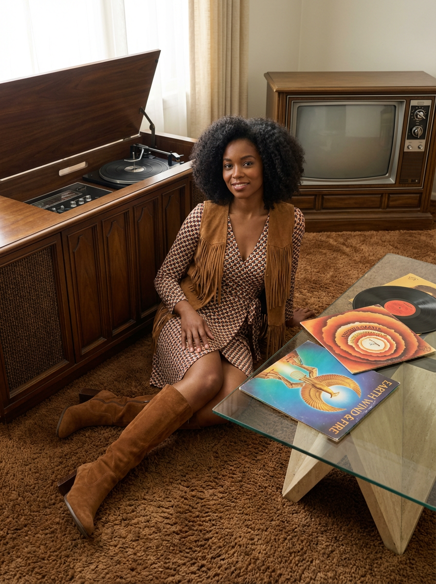 model in a 70s living room with shag carpet, wearing a wrap dress with knee-high boots and fringe vest , sitting next to a console stereo with built-in turntable, collection of vinyl records spread on a glass coffee table with geometric base, wood-paneled TV with dial tuner