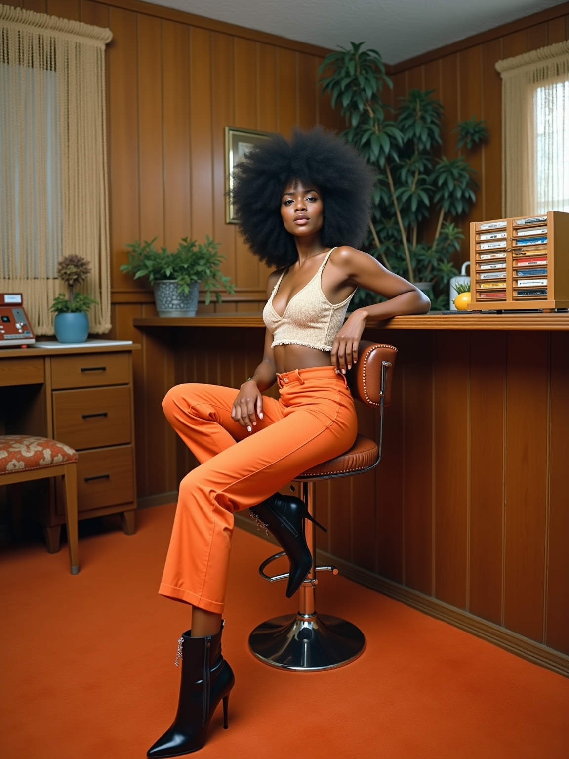 model in a 70s rec room with wood paneling and orange carpet, wearing hot pants with go-go boots and a crop top , sitting at a bar area with a collection of 8-track tapes in a wooden rack, rotary phone on the counter, beaded curtains and hanging plants decorating the space