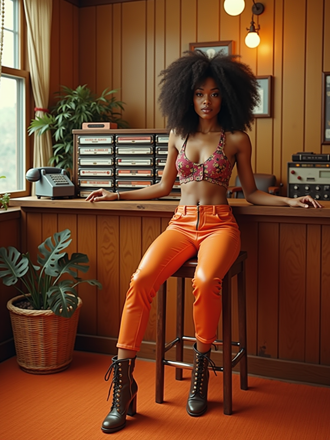 model in a 70s rec room with wood paneling and orange carpet, wearing hot pants with go-go boots and a crop top , sitting at a bar area with a collection of 8-track tapes in a wooden rack, rotary phone on the counter, beaded curtains and hanging plants decorating the space