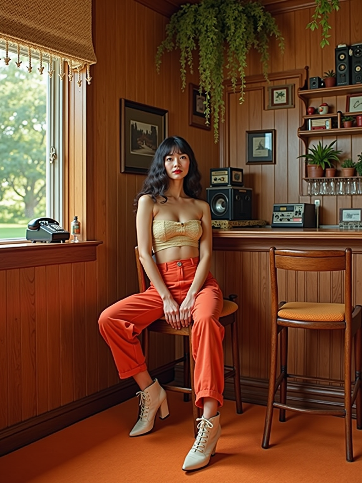 model in a 70s rec room with wood paneling and orange carpet, wearing hot pants with go-go boots and a crop top , sitting at a bar area with a collection of 8-track tapes in a wooden rack, rotary phone on the counter, beaded curtains and hanging plants decorating the space