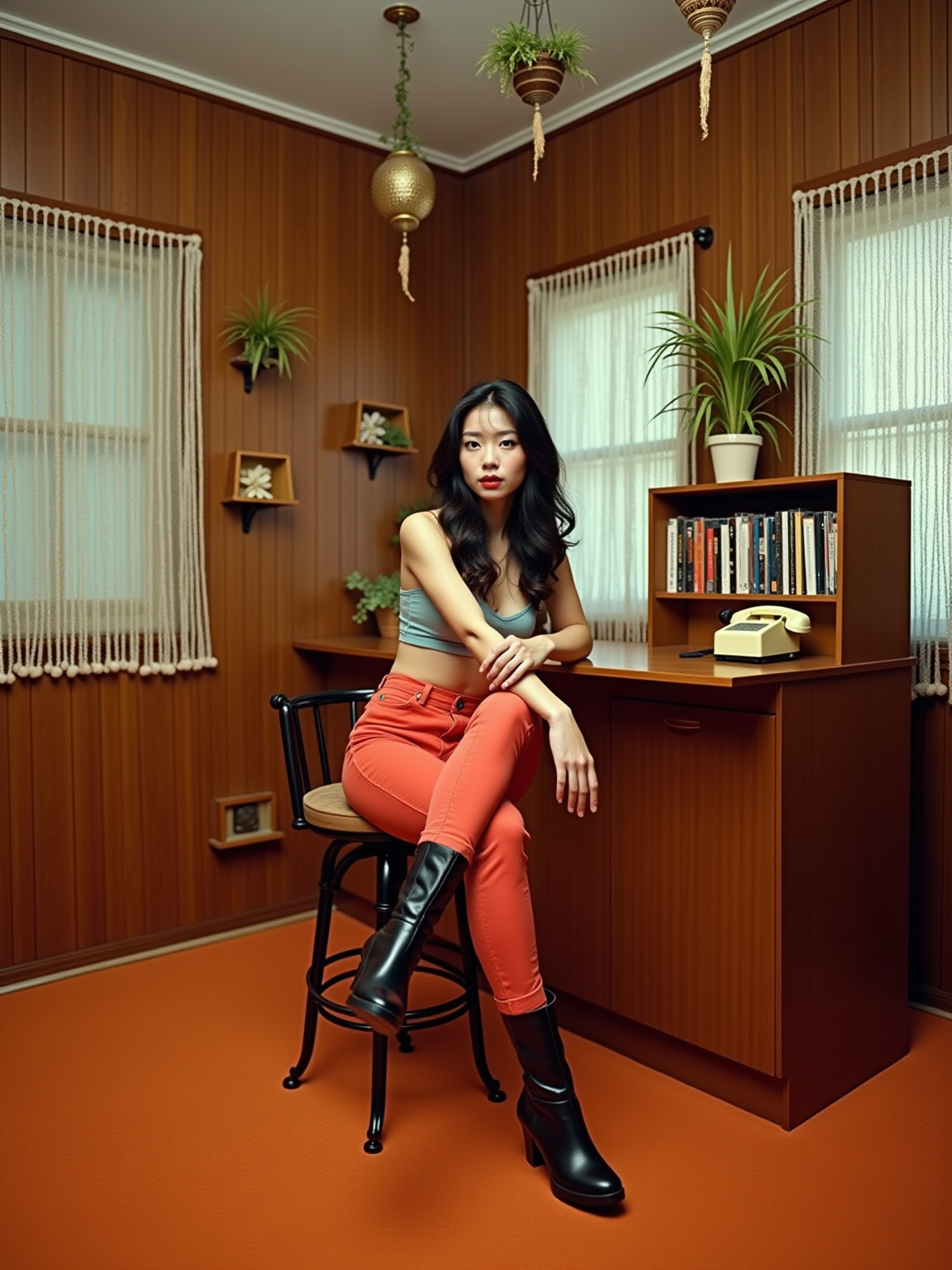 model in a 70s rec room with wood paneling and orange carpet, wearing hot pants with go-go boots and a crop top , sitting at a bar area with a collection of 8-track tapes in a wooden rack, rotary phone on the counter, beaded curtains and hanging plants decorating the space