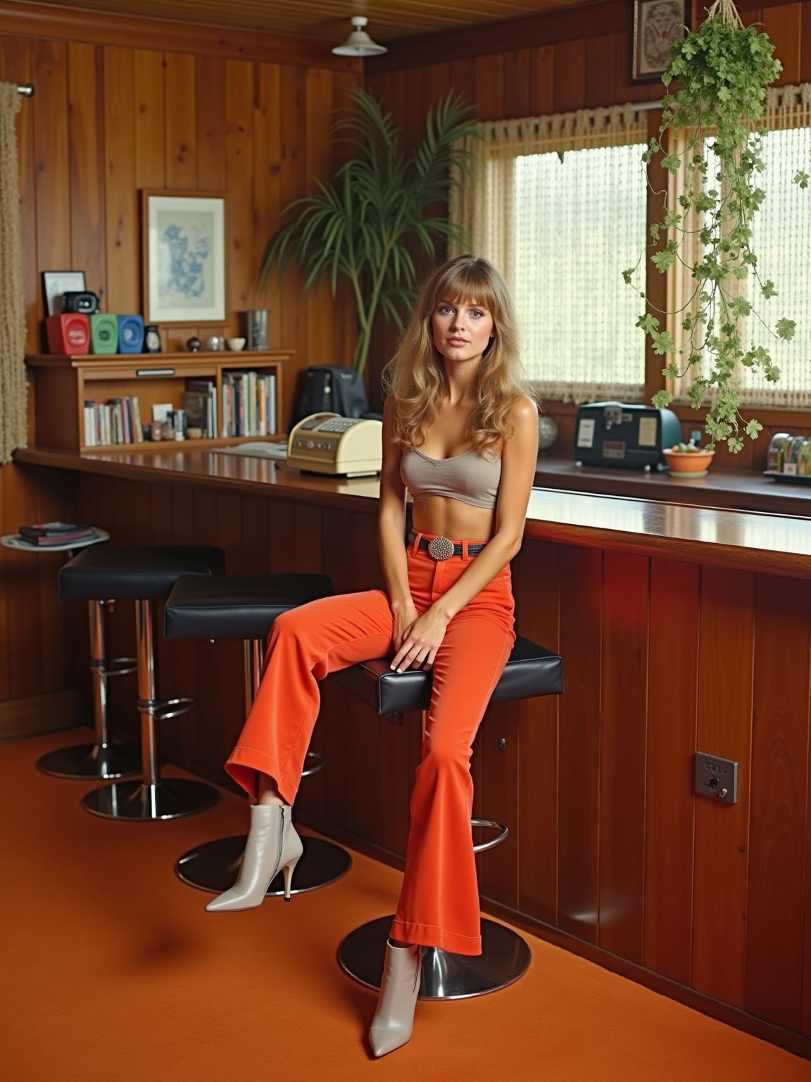 model in a 70s rec room with wood paneling and orange carpet, wearing hot pants with go-go boots and a crop top , sitting at a bar area with a collection of 8-track tapes in a wooden rack, rotary phone on the counter, beaded curtains and hanging plants decorating the space