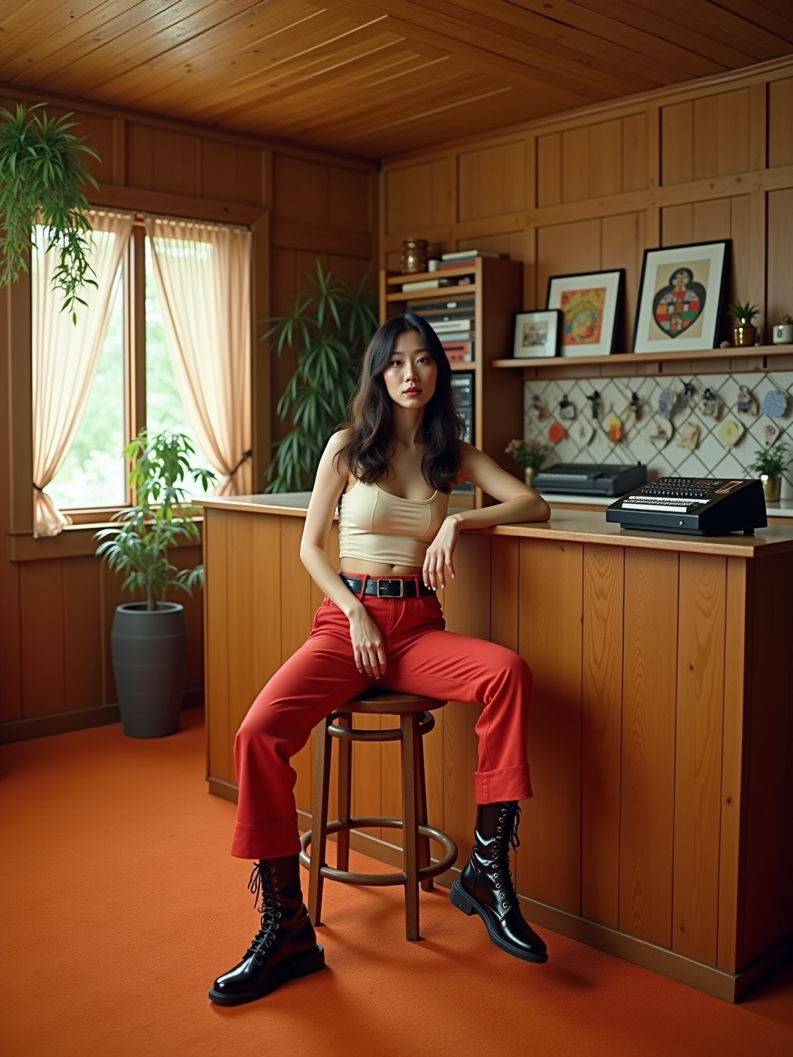 model in a 70s rec room with wood paneling and orange carpet, wearing hot pants with go-go boots and a crop top , sitting at a bar area with a collection of 8-track tapes in a wooden rack, rotary phone on the counter, beaded curtains and hanging plants decorating the space