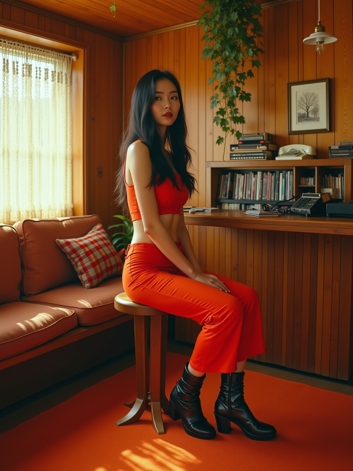 model in a 70s rec room with wood paneling and orange carpet, wearing hot pants with go-go boots and a crop top , sitting at a bar area with a collection of 8-track tapes in a wooden rack, rotary phone on the counter, beaded curtains and hanging plants decorating the space