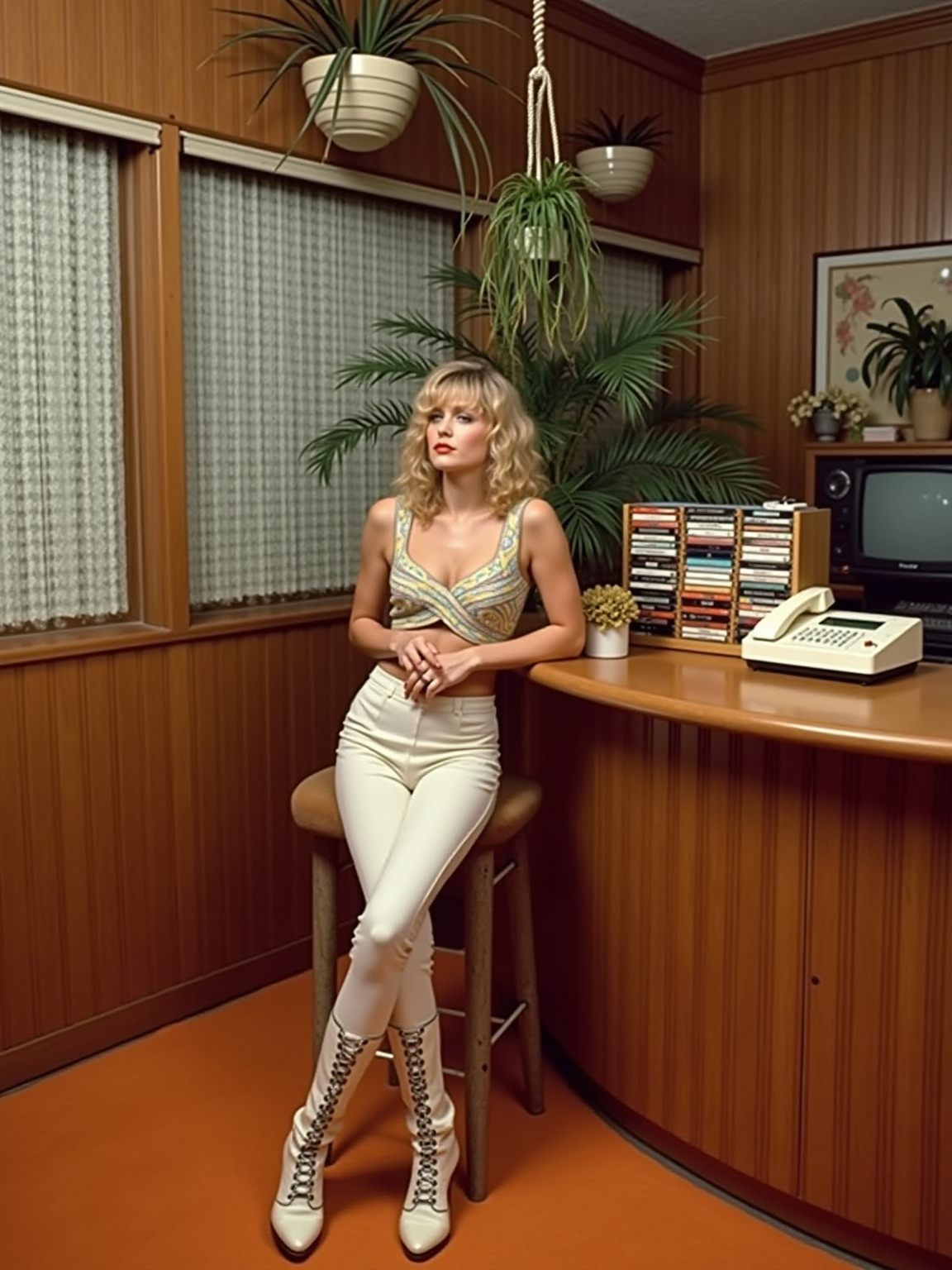model in a 70s rec room with wood paneling and orange carpet, wearing hot pants with go-go boots and a crop top , sitting at a bar area with a collection of 8-track tapes in a wooden rack, rotary phone on the counter, beaded curtains and hanging plants decorating the space