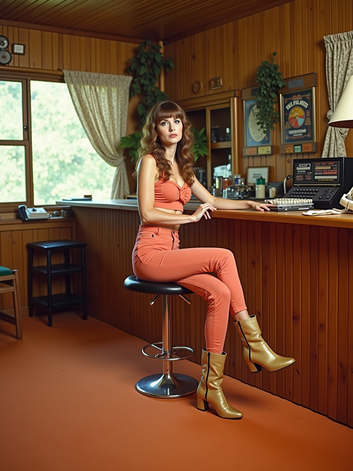 model in a 70s rec room with wood paneling and orange carpet, wearing hot pants with go-go boots and a crop top , sitting at a bar area with a collection of 8-track tapes in a wooden rack, rotary phone on the counter, beaded curtains and hanging plants decorating the space