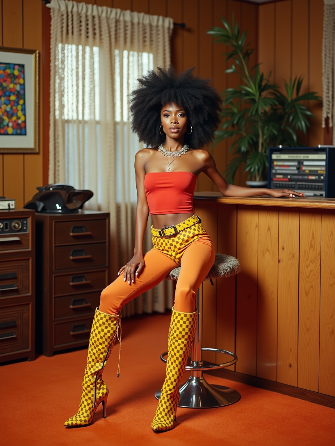 model in a 70s rec room with wood paneling and orange carpet, wearing hot pants with go-go boots and a crop top , sitting at a bar area with a collection of 8-track tapes in a wooden rack, rotary phone on the counter, beaded curtains and hanging plants decorating the space