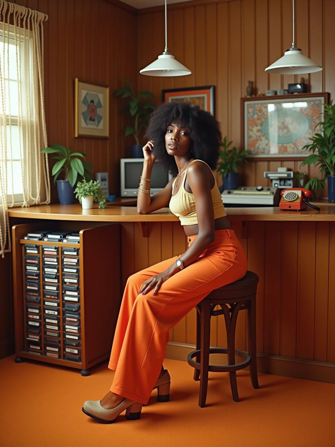 model in a 70s rec room with wood paneling and orange carpet, wearing hot pants with go-go boots and a crop top , sitting at a bar area with a collection of 8-track tapes in a wooden rack, rotary phone on the counter, beaded curtains and hanging plants decorating the space