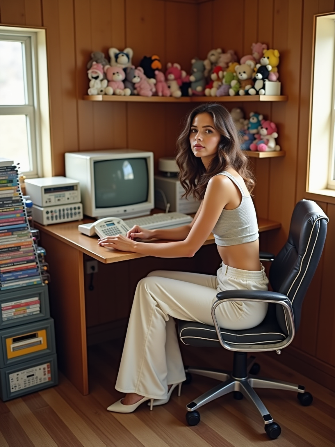 model in a 90s bedroom with wood paneling, wearing platform shoes, a crop top, and wide-leg pants , sitting at a desk with a clear plastic phone and answering machine, cassette storage tower filled with tapes, beanie babies on shelves