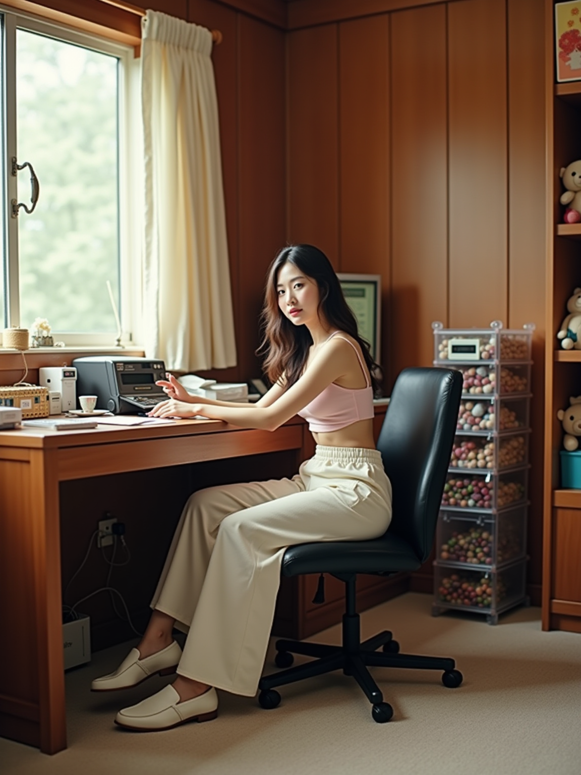 model in a 90s bedroom with wood paneling, wearing platform shoes, a crop top, and wide-leg pants , sitting at a desk with a clear plastic phone and answering machine, cassette storage tower filled with tapes, beanie babies on shelves