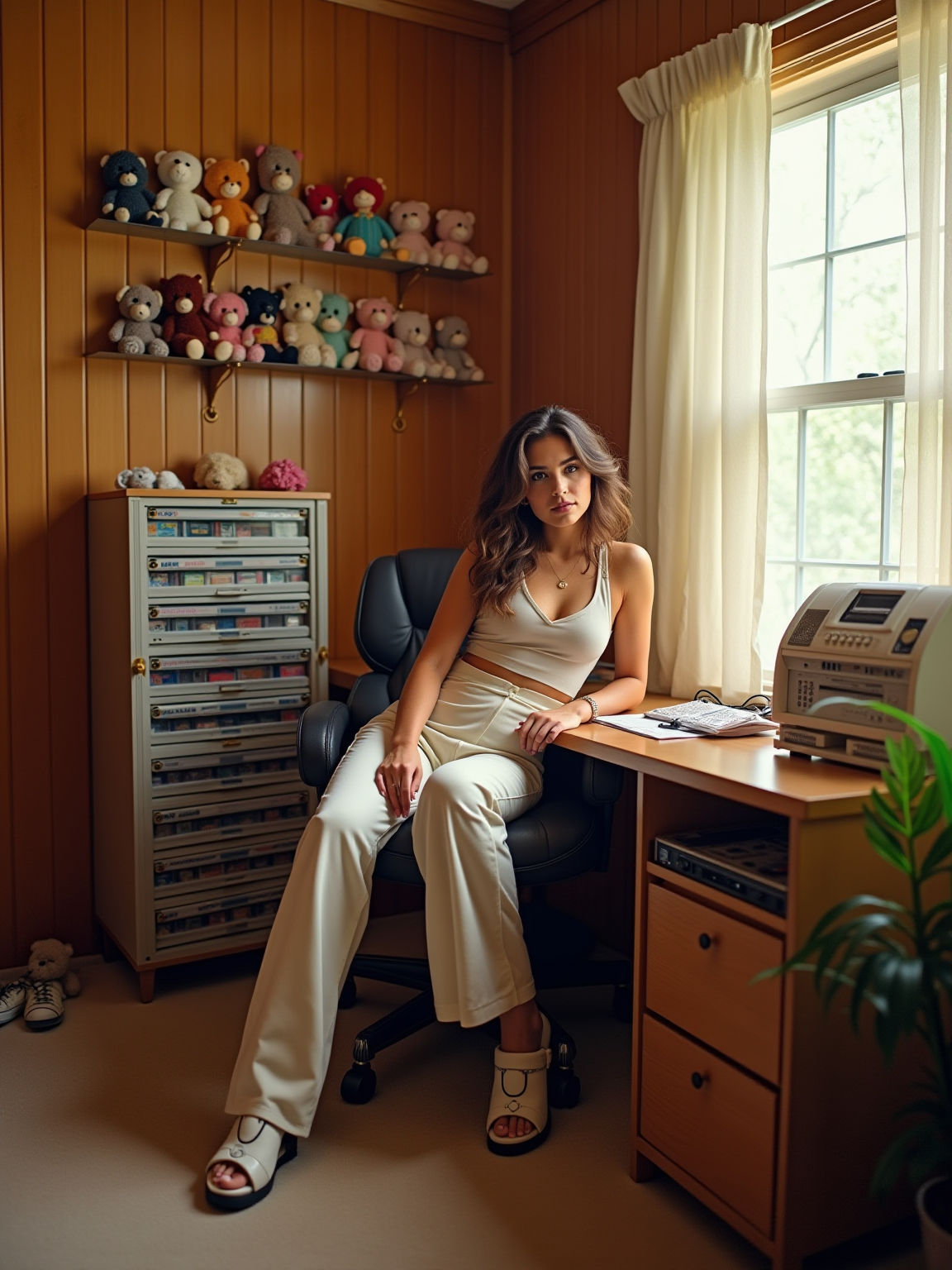 model in a 90s bedroom with wood paneling, wearing platform shoes, a crop top, and wide-leg pants , sitting at a desk with a clear plastic phone and answering machine, cassette storage tower filled with tapes, beanie babies on shelves