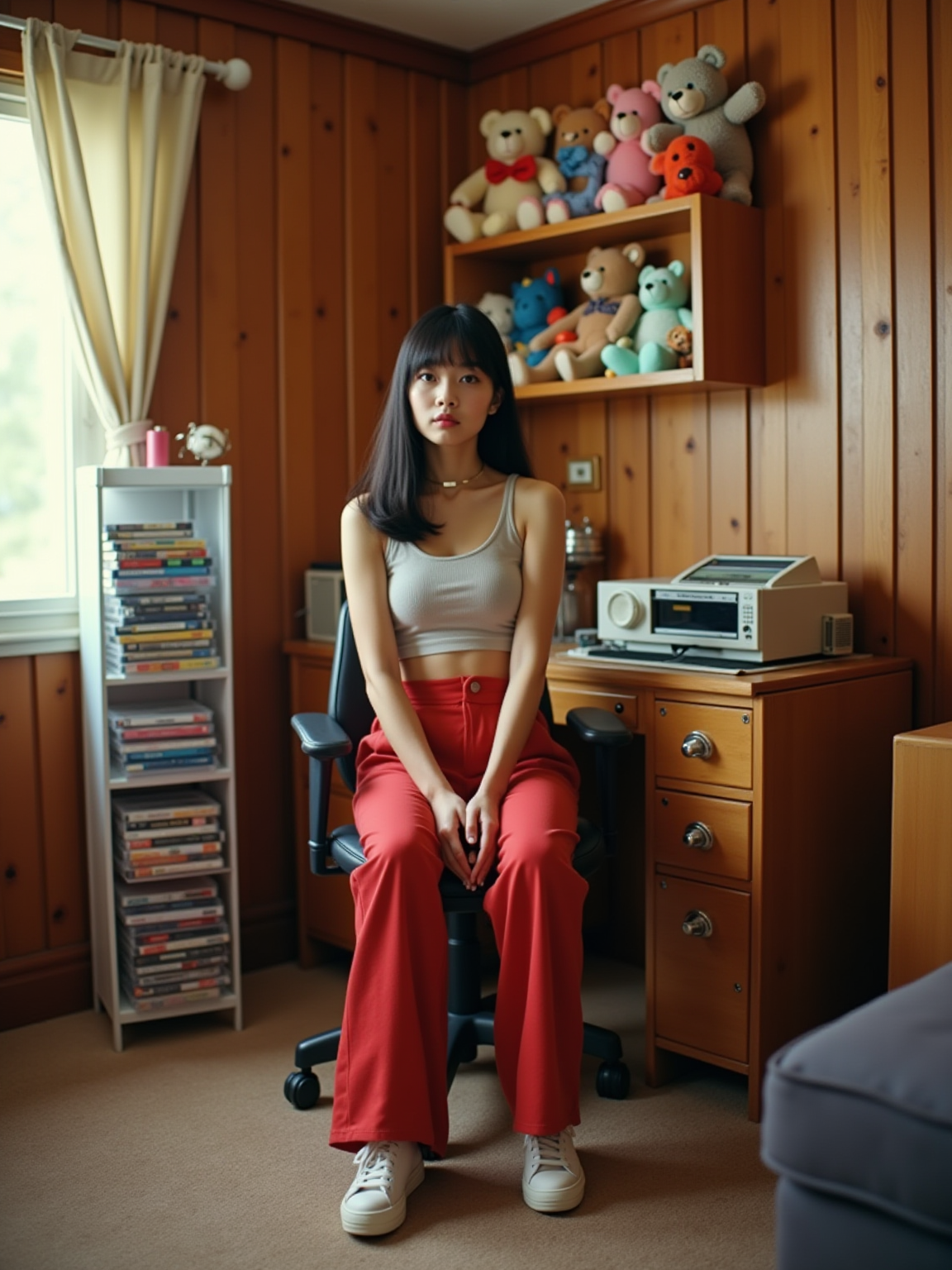 model in a 90s bedroom with wood paneling, wearing platform shoes, a crop top, and wide-leg pants , sitting at a desk with a clear plastic phone and answering machine, cassette storage tower filled with tapes, beanie babies on shelves
