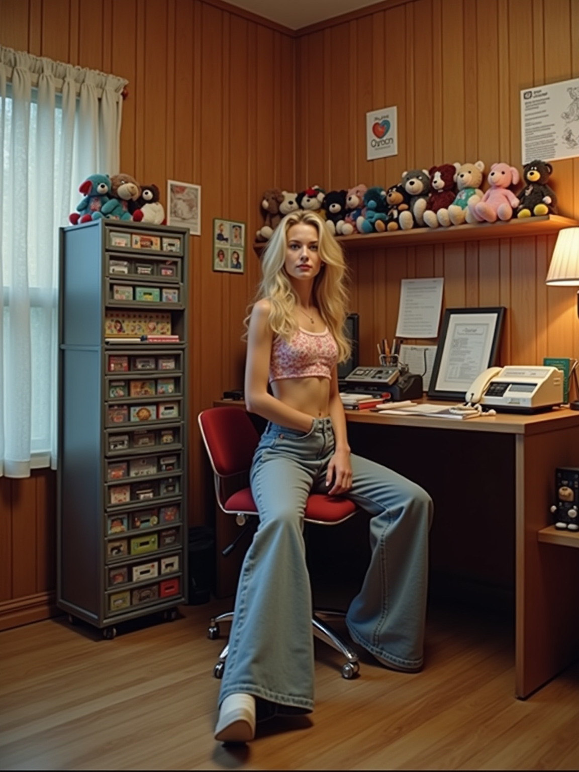 model in a 90s bedroom with wood paneling, wearing platform shoes, a crop top, and wide-leg pants , sitting at a desk with a clear plastic phone and answering machine, cassette storage tower filled with tapes, beanie babies on shelves