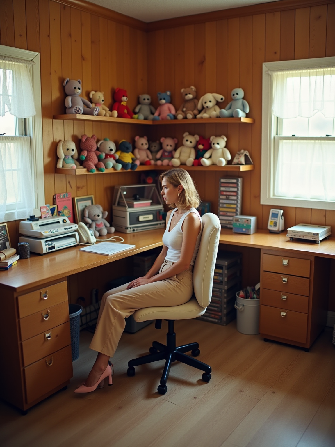 model in a 90s bedroom with wood paneling, wearing platform shoes, a crop top, and wide-leg pants , sitting at a desk with a clear plastic phone and answering machine, cassette storage tower filled with tapes, beanie babies on shelves