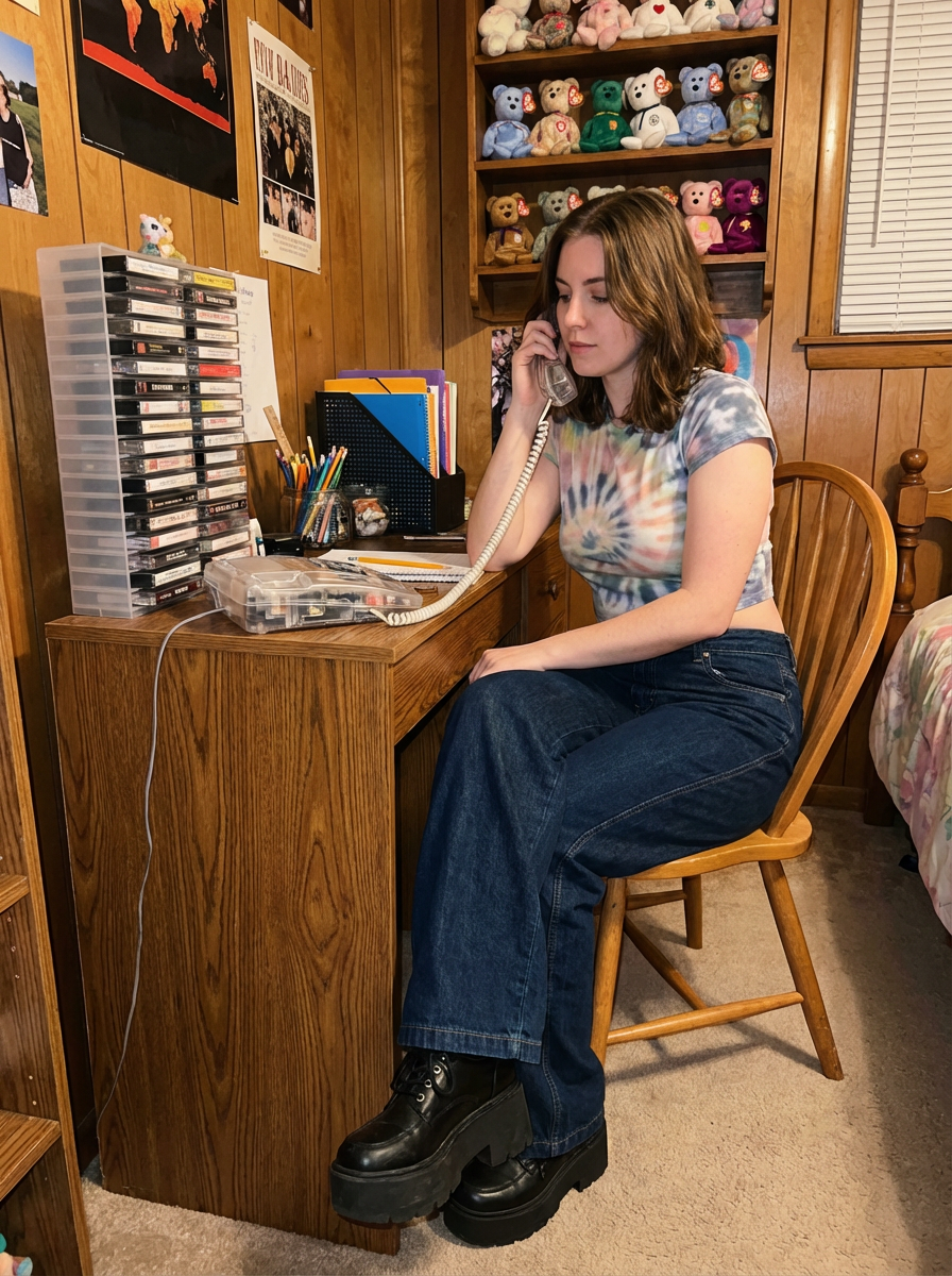 model in a 90s bedroom with wood paneling, wearing platform shoes, a crop top, and wide-leg pants , sitting at a desk with a clear plastic phone and answering machine, cassette storage tower filled with tapes, beanie babies on shelves