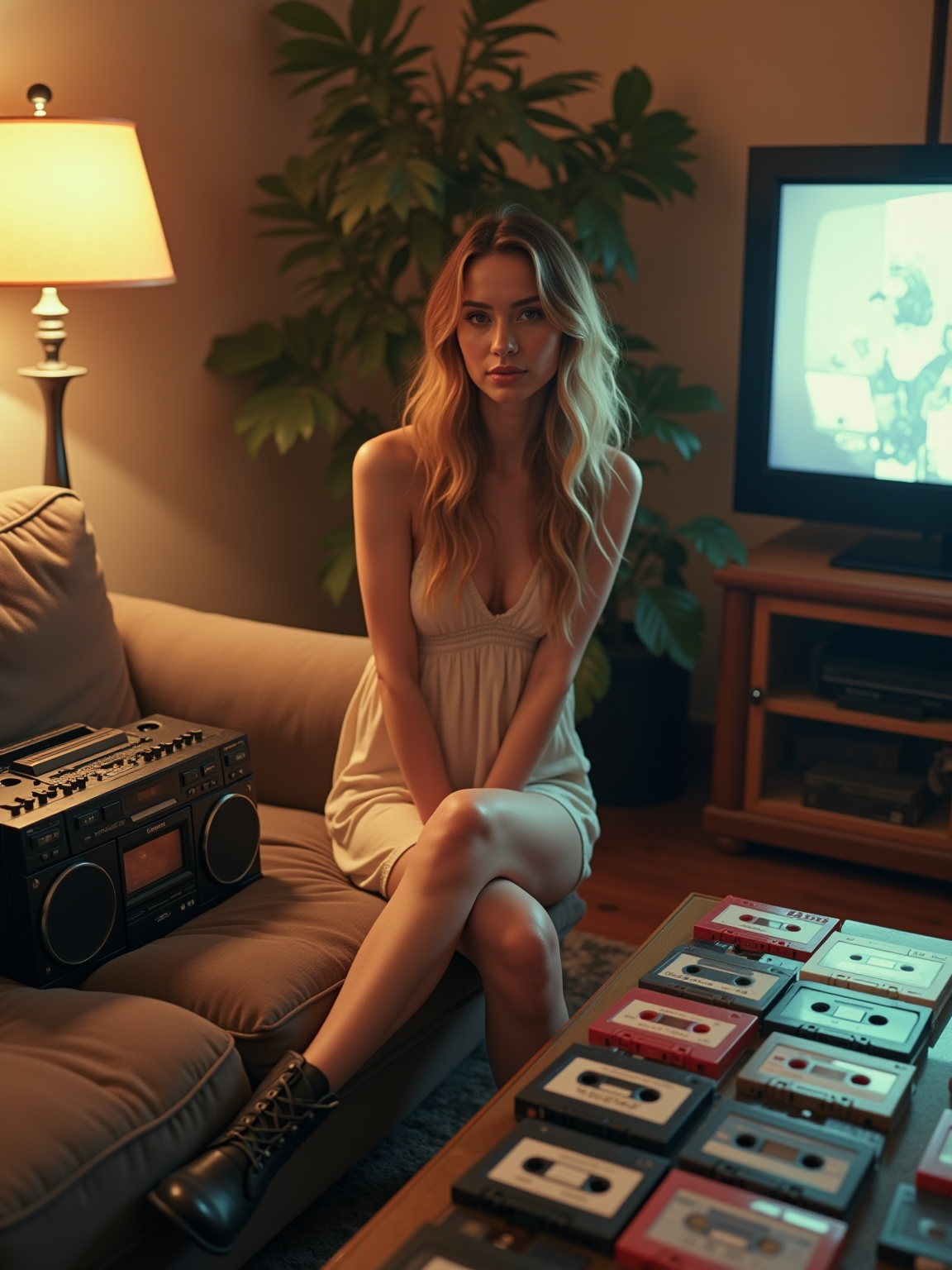 model in a 90s living room, wearing a slip dress over a t-shirt with combat boots , sitting next to a boombox with dual cassette decks, collection of mixtapes spread on a glass coffee table, VHS tapes stacked by a tube TV